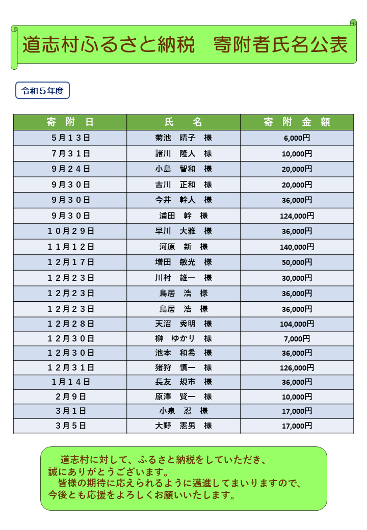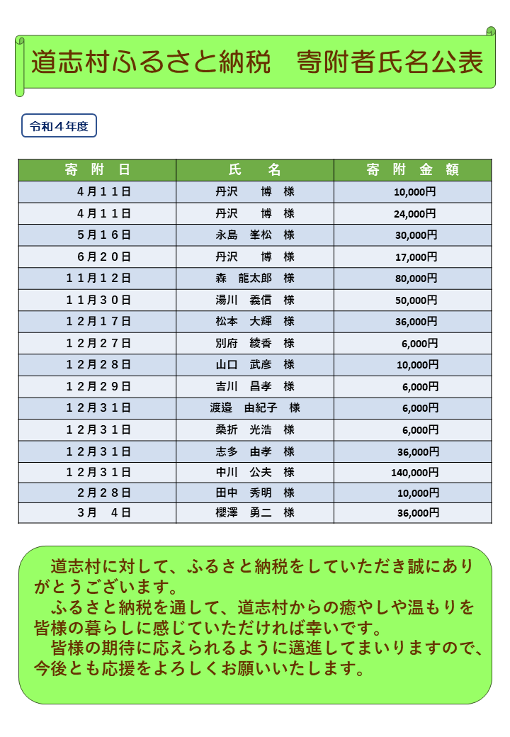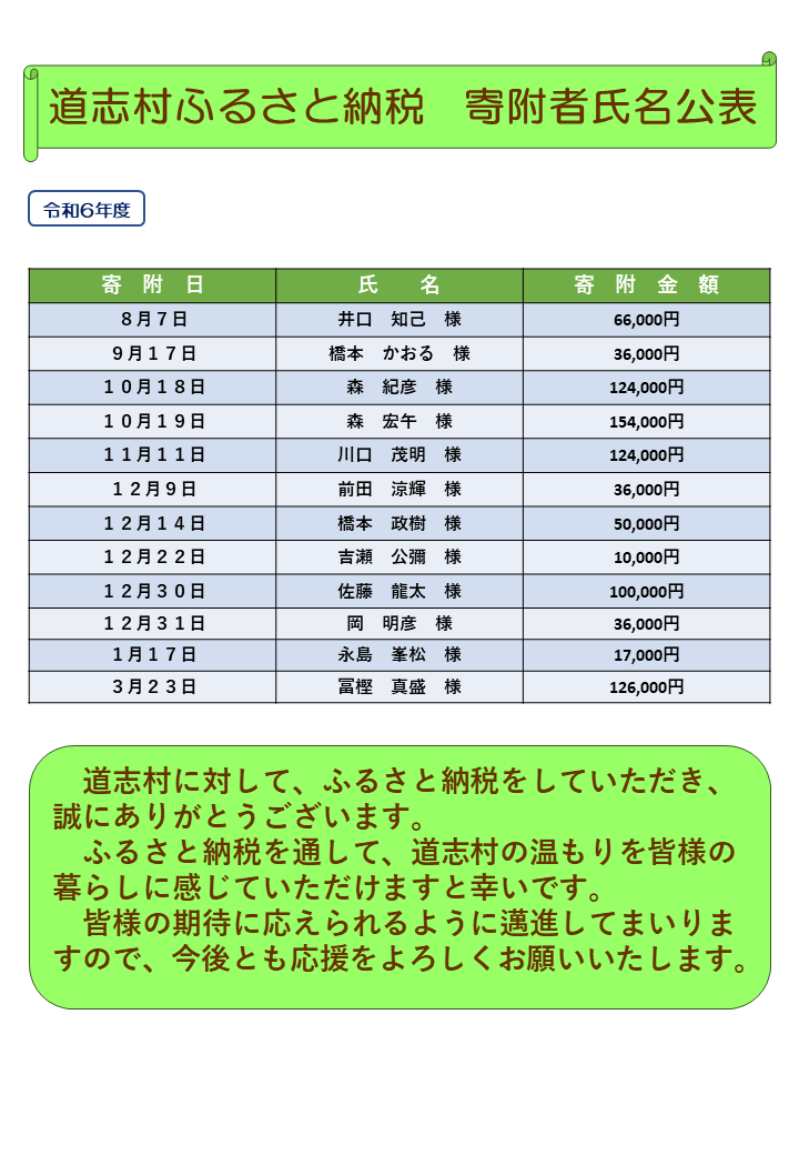 道志村に「ふるさと納税(寄附)」をいただいた人を公表します。