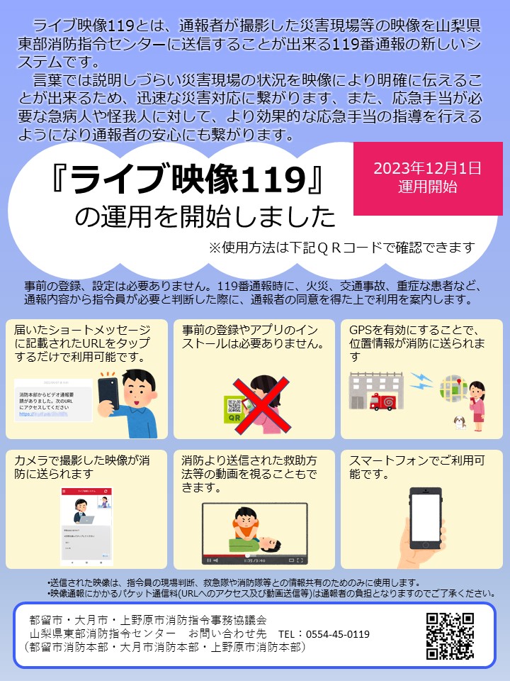ライブ映像119とは、通報者が撮影した災害現場等の映像を山梨県東部消防指令センターに送信することが出来る119番通報の新しいシステムです。言葉では説明しづらい災害現場の状況を映像により明確に伝えることが出来るため、迅速な災害対応に繋がります。