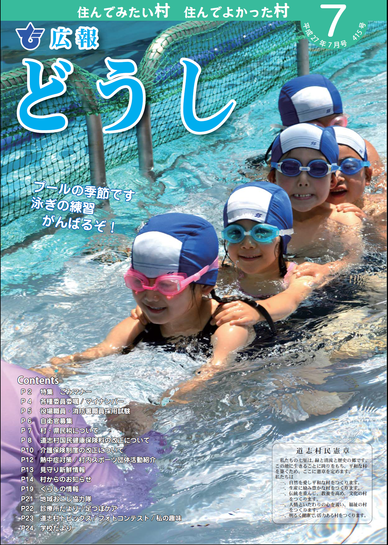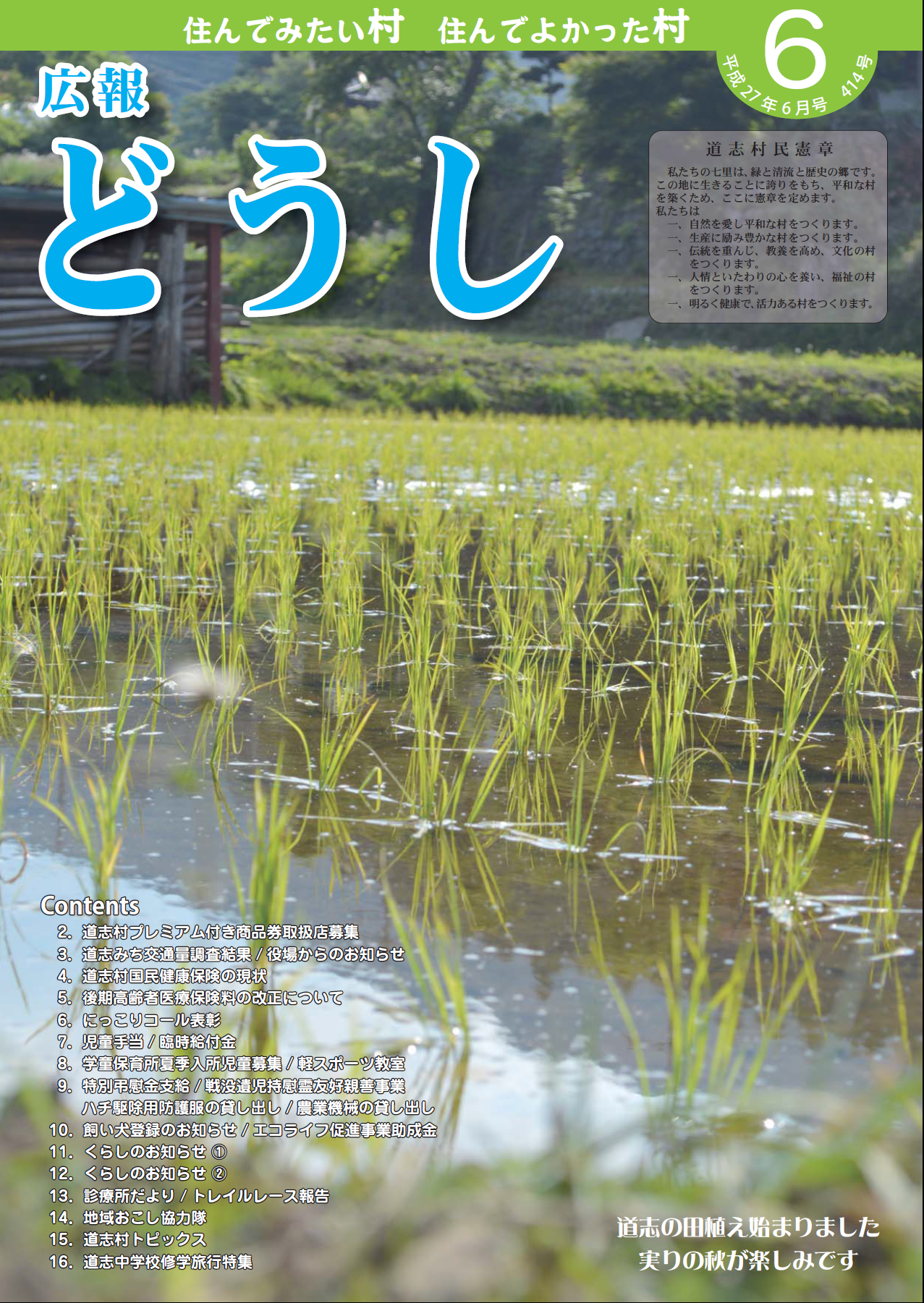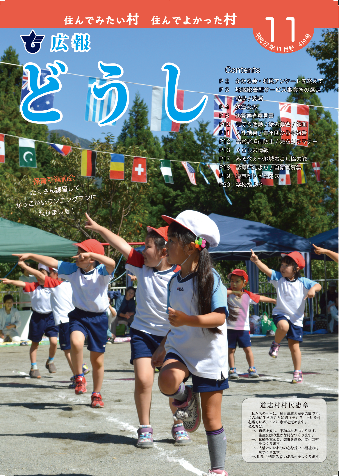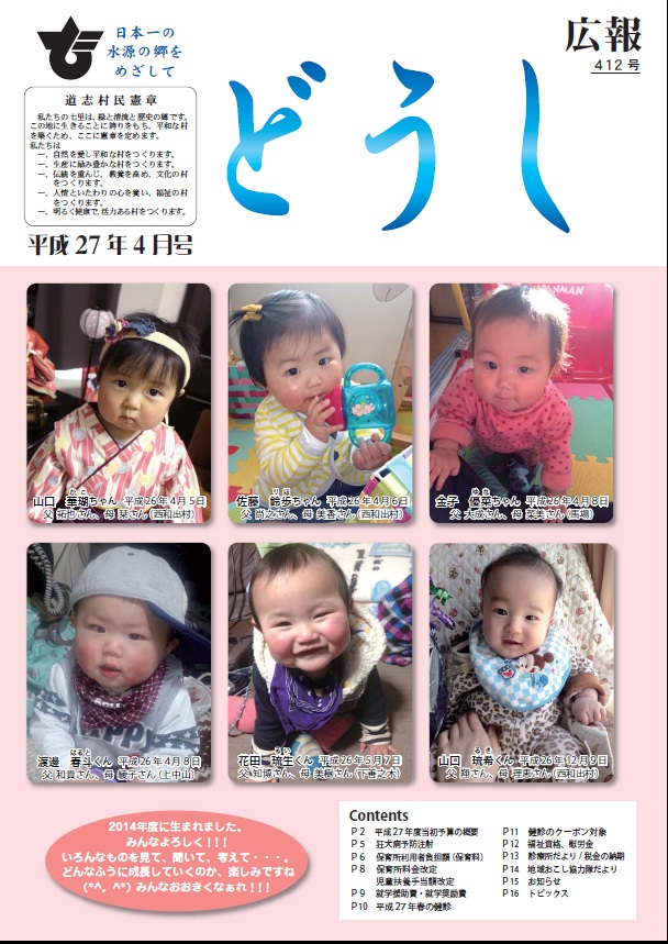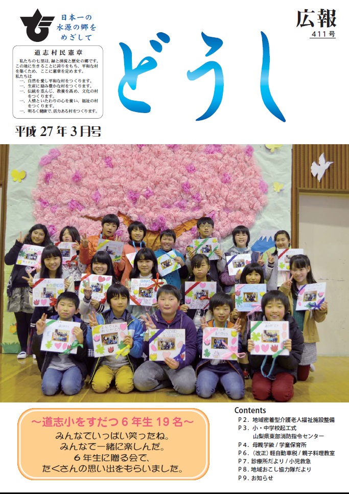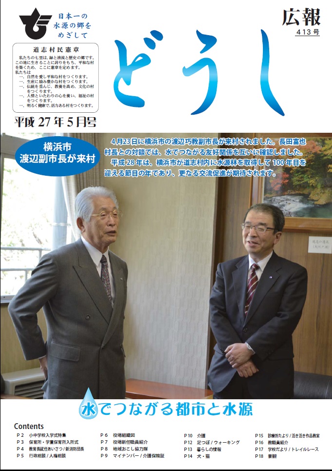 ・特集 ごみマナー ・各種委員委嘱/ マイナンバー ・役場職員・消防署職員採用試験 ・自衛官募集 ・村・県民税について ・道志村国民健康保険料の改正について ・介護保険制度の改正について ・熱中症対策/ 村内スポーツ団体活動紹介 ・見守り新鮮情報 ・村からのお知らせ ・くらしの情報 ・地域おこし協力隊 ・診療所だより/ 足つぼケア ・道志村トピックス/ フォトコンテスト/ 私の趣味 ・学校だより |