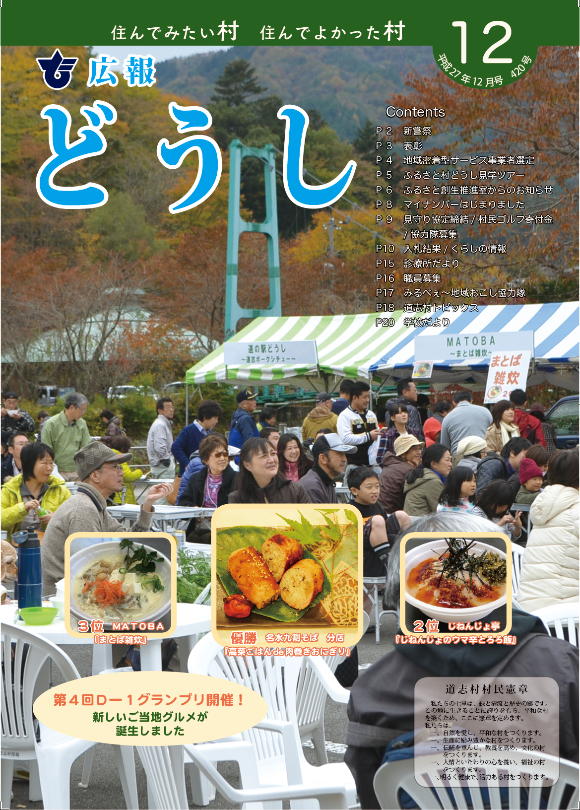 | ・新嘗祭 ・表彰 ・地域密着型サービス事業者選定 ・ふるさと村どうし見学ツアー ・ふるさと創生推進室からのお知らせ ・マイナンバーはじまりました ・見守り協定締結/ 村民ゴルフ寄付金/ 協力隊募集 ・入札結果/ くらしの情報 ・診療所だより ・職員募集 ・みるべぇ~地域おこし協力隊 ・道志村トピックス ・学校だより |