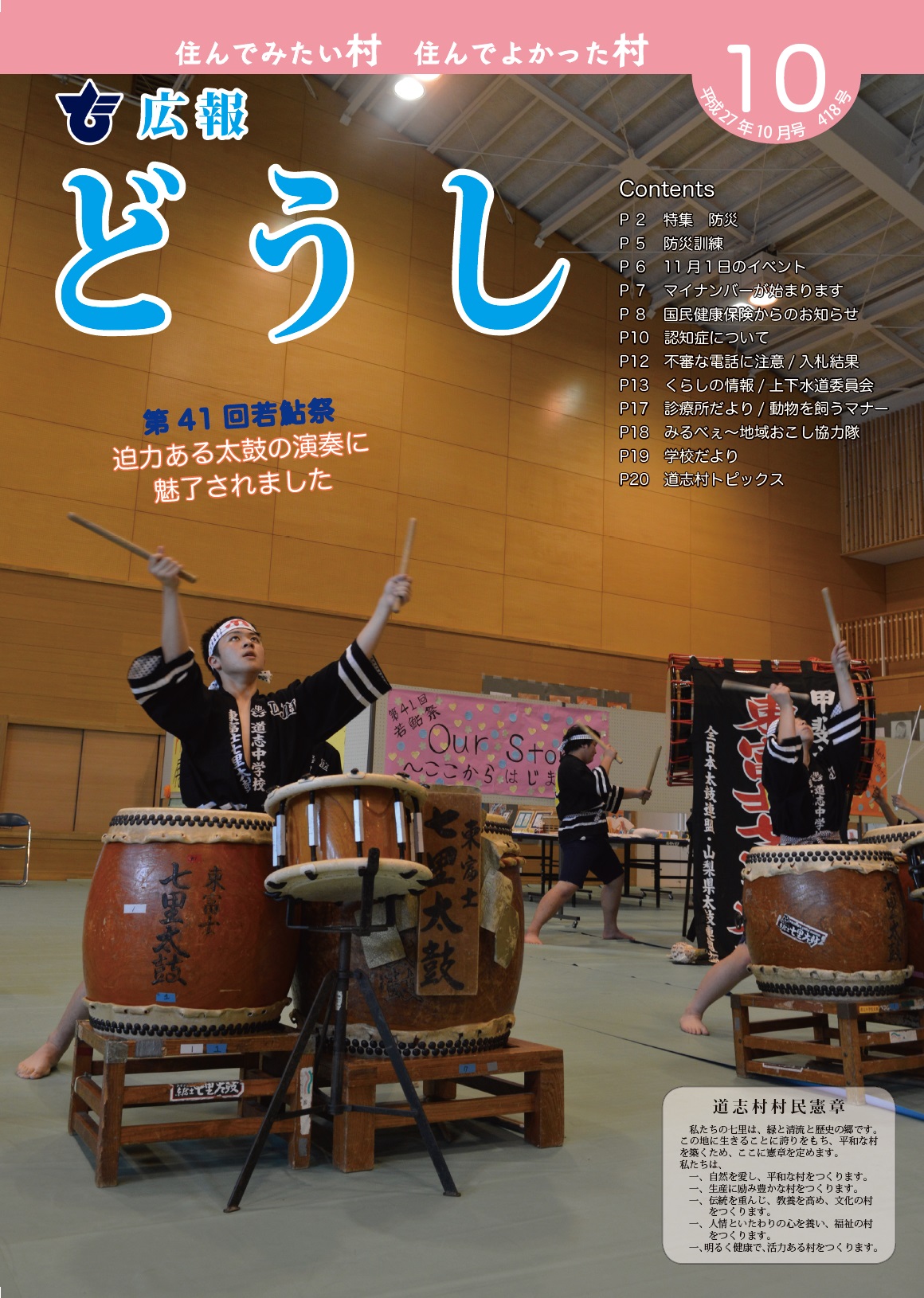 ・特集 防災 ・防災訓練 ・11 月1日のイベント ・マイナンバーが始まります ・国民健康保険からのお知らせ ・認知症について ・不審な電話に注意/ 入札結果 ・くらしの情報/ 上下水道委員会 ・診療所だより/ 動物を飼うマナー ・みるべぇ〜地域おこし協力隊 ・学校だより ・道志村トピックス |