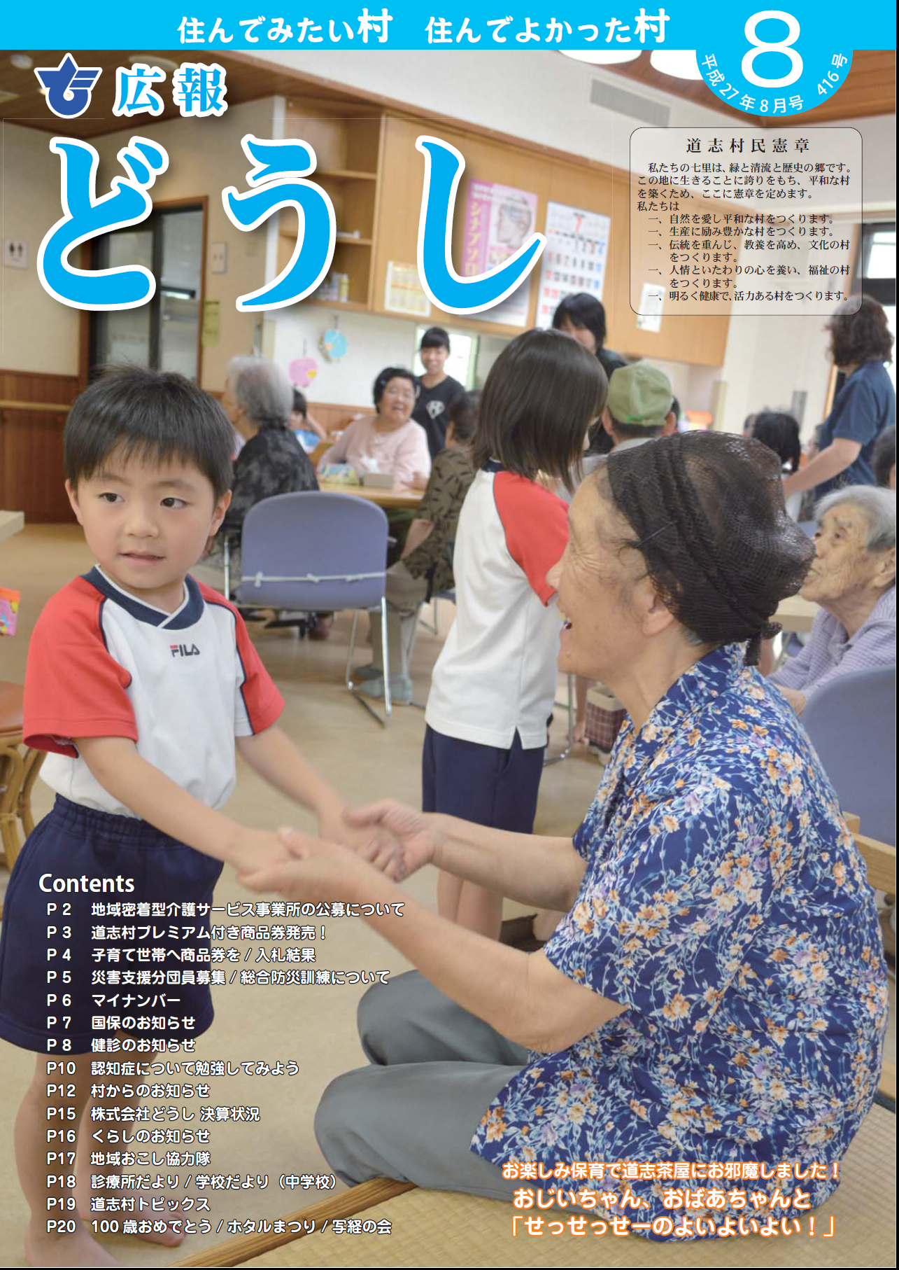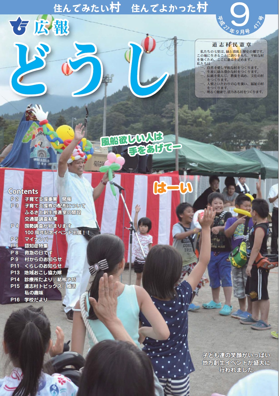 ・子育て支援事業 開催 ・ 子育て支援券の配布について ・ふるさと創生推進室の開設/交通量調査結果 ・国勢調査が始まります ・100 周年記念イベント出展!! ・ マイナンバー ・認知症特集 ・救急の日です ・村からのお知らせ ・くらしのお知らせ ・地域おこし協力隊 ・診療所たより/ 結核予防 ・道志村トピックス/ 婚活/私の趣味 ・学校だより |