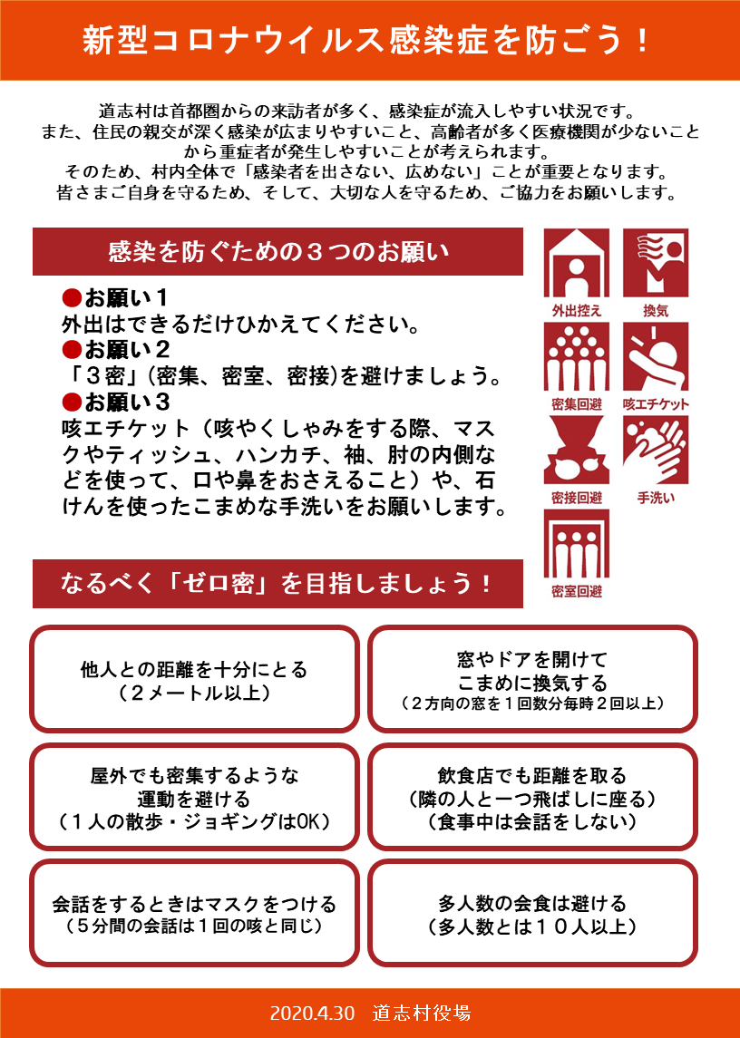 自治会活動は、村民の皆様の自主性により行われているところですが、自治会活動の実施と新型コロナウイルス感染拡大防止の両立を図るため、イベント、会議等を開催する際には、「3密」を避け、不参加希望者への配慮や、極力最小限の人数で開催するなど、感染防止対策に引き続きご留意頂きますようお願いいたします。